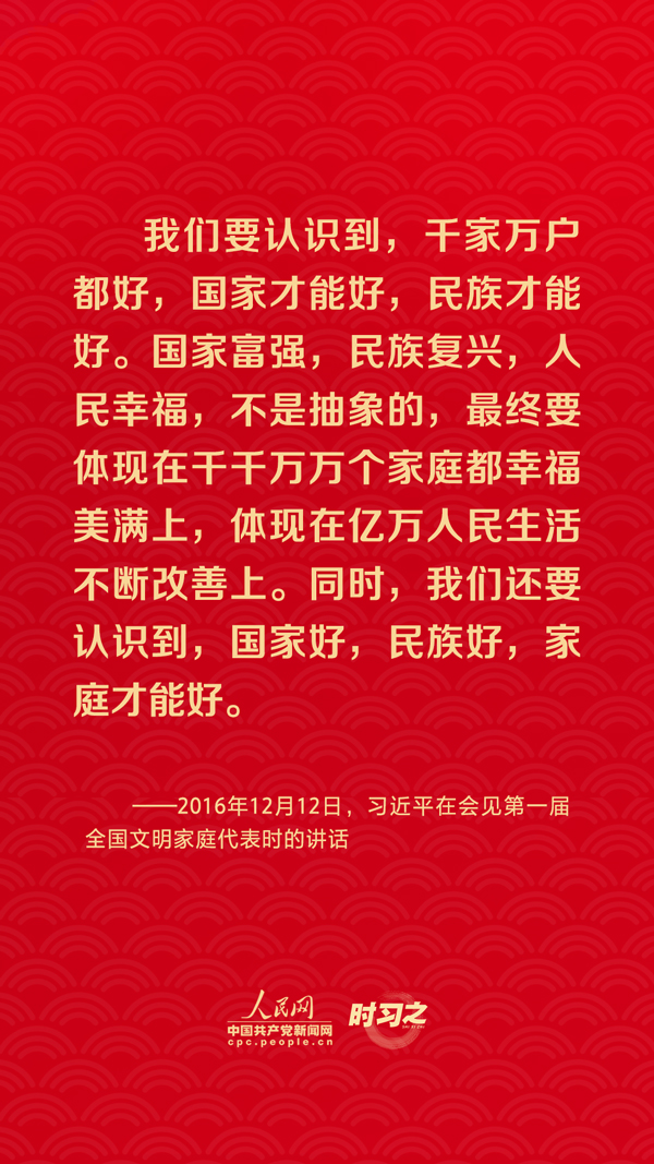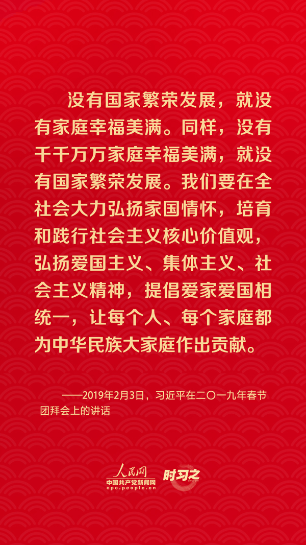 團(tuán)圓是春節(jié)永恒的主題。“沒(méi)有國(guó)家繁榮發(fā)展,就沒(méi)有家庭幸福美滿(mǎn)。同樣,沒(méi)有千千萬(wàn)萬(wàn)家庭幸福美滿(mǎn),就沒(méi)有國(guó)家繁榮發(fā)展?!绷?xí)近平總書(shū)記曾在多個(gè)場(chǎng)合深刻闡述家庭與國(guó)家之間的關(guān)系,從他的話語(yǔ)里一起感悟深厚的家國(guó)情懷。