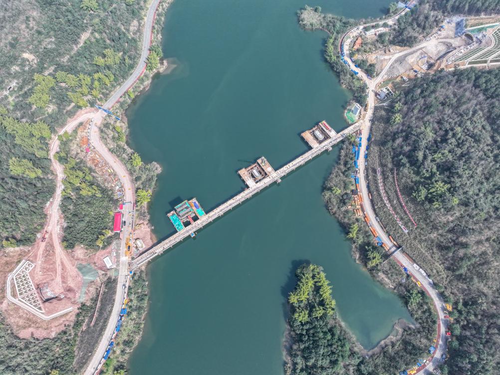 ??這是2月19日拍攝的位于重慶市銅梁區(qū)的成渝中線高鐵玄天湖大橋建設現場(無人機照片)。新華社記者 唐奕 攝