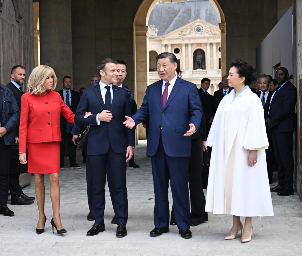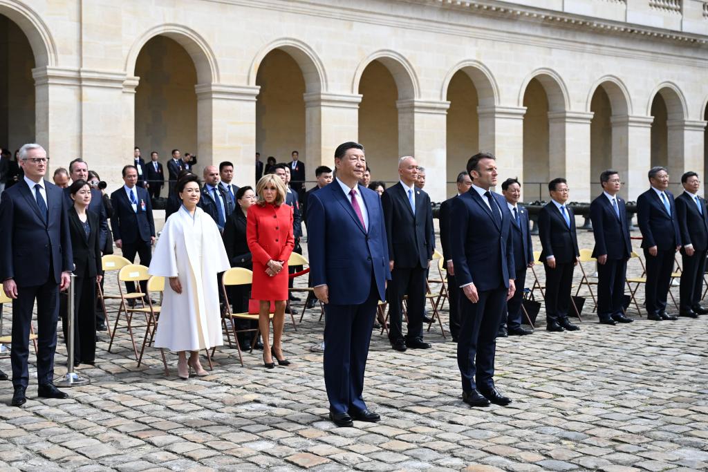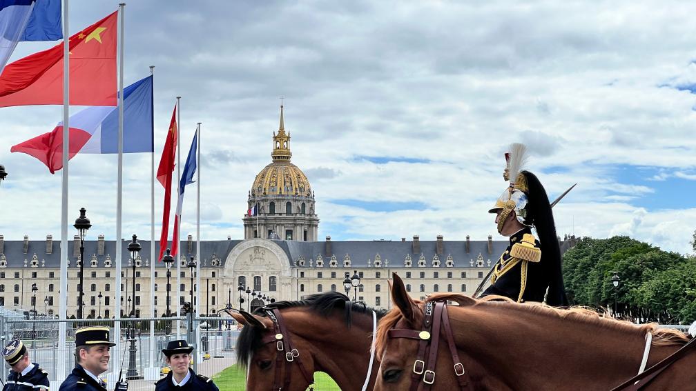 ??五月的巴黎,風(fēng)和景明。塞納河畔,榮軍院金色穹頂熠熠生輝,五星紅旗和藍(lán)白紅三色旗迎風(fēng)飄揚(yáng)。