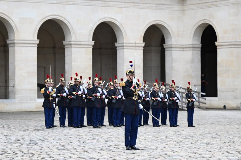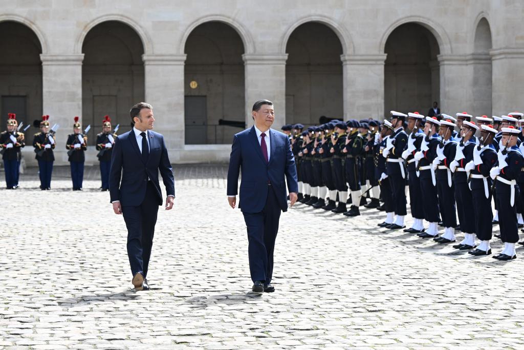 ??當(dāng)天下午,習(xí)近平在巴黎出席馬克龍舉行的隆重盛大歡迎儀式。兩國(guó)元首檢閱法蘭西共和國(guó)衛(wèi)隊(duì)和陸??杖妰x仗隊(duì),并觀看分列式。