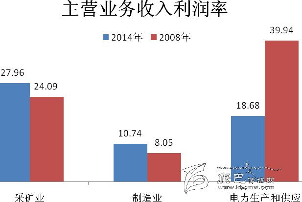 2013年,規(guī)模以上工業(yè)企業(yè)法人單位總資產(chǎn)貢獻(xiàn)率為8.46%,比2008年下降4.56個(gè)百分點(diǎn)。主營業(yè)務(wù)收入利潤率為18.83%,比2008年下降11.12個(gè)百分點(diǎn)。其中,采礦業(yè)為27.96%,比2008年上升3.87個(gè)百分點(diǎn);制造業(yè)為10.74%,比2008年上升2.69個(gè)百分點(diǎn);電力、熱力、燃?xì)饧八a(chǎn)和供應(yīng)業(yè)為18.68%,比2008年下降21.26 個(gè)百分點(diǎn)(詳見表2-4)。