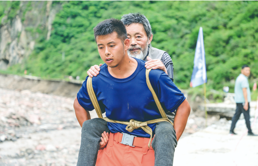 鹽水溪村71歲的村民倪月富,腰以下重度殘疾,行動極為不便,被困家中。關鍵時刻,村組干部及時前來轉移。由于轉移路線漫長,且沿途存在垮塌狀況,村黨員干部接力背送老人。