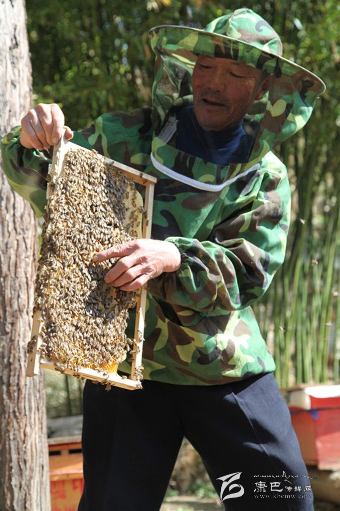 1974年,因為養(yǎng)蜂,高廷明成了割“尾巴”的對象,被連續(xù)批斗了好幾個晚上。但所有這些,都沒有阻擋他養(yǎng)蜂的喜好,反而激發(fā)了他發(fā)展壯大養(yǎng)蜂業(yè)的欲望。“我們這里有桃花、李花、金銀花、油菜花,山上還有成片的五倍子花,五倍子花粉成糖顏色最好,金銀花蜜則有藥用價值。養(yǎng)蜂講究‘三睛兩雨’,最好是晚上下雨,白天出太陽,這種天氣花粉最好,產(chǎn)糖高。由于人手不夠,我都采用小轉(zhuǎn)場放蜂,一般只轉(zhuǎn)場兩、三公里,走遠了一個人不方便。采蜜時要把準季節(jié),要不然會出現(xiàn)人與蜜蜂搶蜜的現(xiàn)象,說不定還會被蜜蜂蟄傷。”在院子后面的一片樹林里,高廷明一邊分蜂一邊對記者說。他還告訴記者,雖然自己天天與蜜蜂打交道,這些有靈性的小家伙似乎已經(jīng)習慣主人的氣味,但自己還是被蜜蜂蟄傷過。每次被蜜蜂蟄傷時,家里的碘酒就派上了用場。