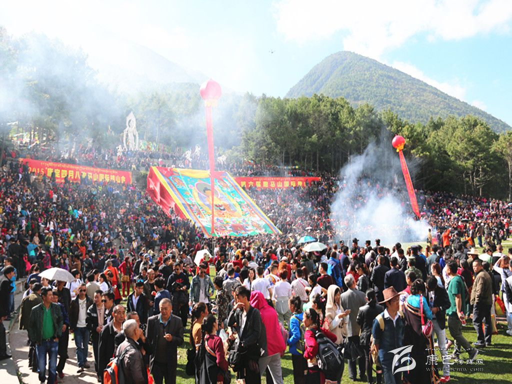 康定“四月八”跑馬山轉(zhuǎn)山會,是自藏傳佛教入康定起就有的活動,至今已有千年歷史。相傳農(nóng)歷四月初八是佛祖釋迦牟尼的誕辰日,這天跑馬山頂?shù)奈迳V杏芯艞l龍吐水為佛祖沐浴,故稱浴佛節(jié)。人們?yōu)榧o(jì)念這一吉祥日子,每逢農(nóng)歷四月初八,便從四面八方不約而同云集康定跑馬山上,載歌載舞,預(yù)祝豐收,場面壯觀,熱鬧非凡。據(jù)初步統(tǒng)計(jì),在今年四月八當(dāng)天,共有近四萬名各族群眾、游客齊聚跑馬山歡度傳統(tǒng)佳節(jié)。