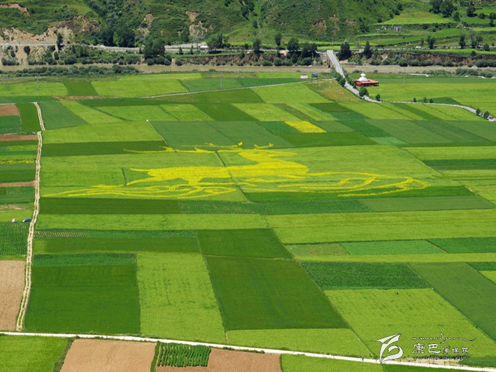 本網(wǎng)訊(記者 張兵 貢呷沙鄧 文/圖) 近日,記者在爐霍縣宜木鄉(xiāng)蝦拉沱村后山觀景平臺(tái)上看到一幅神奇的畫,在平坦的田野中清晰呈現(xiàn)出的一幅金鹿圖案,構(gòu)成圖案的材料是自然生長(zhǎng)的油菜,襯托畫面的是正在不斷成熟的青稞。據(jù)縣農(nóng)牧和科技局領(lǐng)導(dǎo)介紹,這是該縣今年實(shí)施創(chuàng)意觀光農(nóng)業(yè)、全力發(fā)展休閑觀光農(nóng)業(yè)的成果。