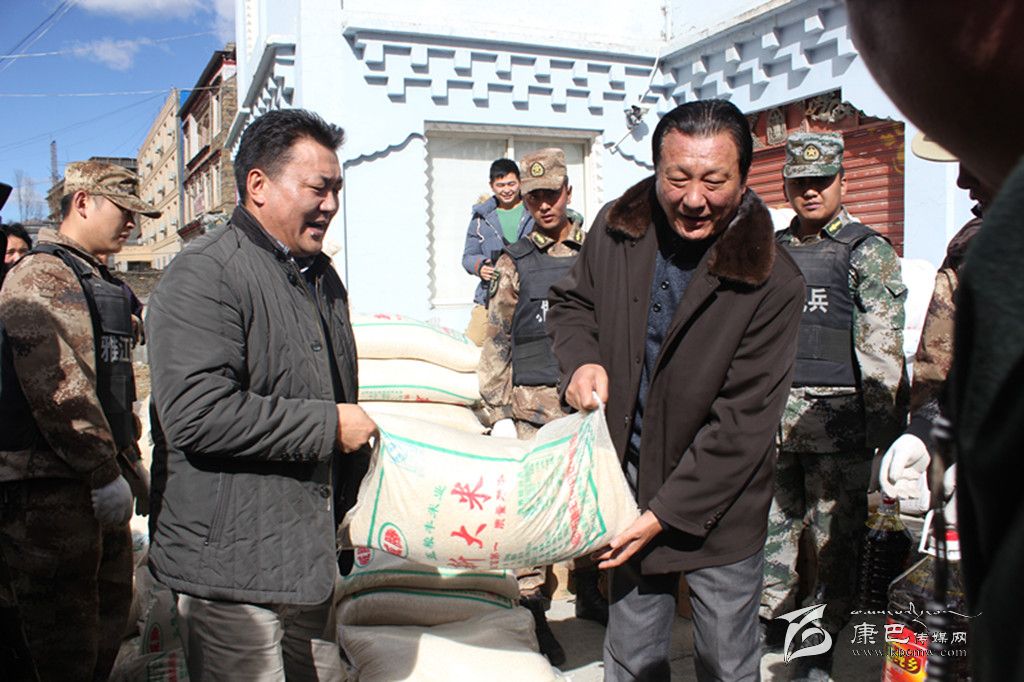 州政協(xié)副主席、縣委書記阿基布珠(右),縣委副書記、縣長(zhǎng)旦燈(左)發(fā)放救災(zāi)物資。