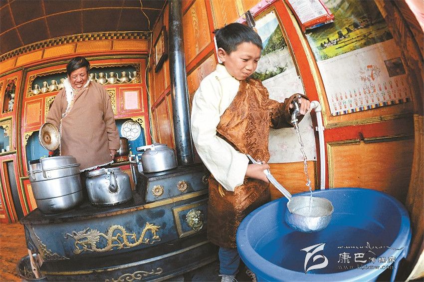 被稱(chēng)為世界高城的理塘縣,“吃水難”過(guò)去一直是當(dāng)?shù)厝罕娚铍y題。2012年實(shí)施對(duì)口援建以來(lái),樂(lè)山市和理塘縣把此項(xiàng)工作列為 “一號(hào)民生工程”來(lái)抓。2013年,樂(lè)山市和理塘縣在位于海拔5000米的理塘縣奔戈鄉(xiāng)境內(nèi)的索絨山上開(kāi)建奪曲河水庫(kù),2014年7月奪曲河水庫(kù)全部竣工,2015年10月,理塘縣首批2200戶自來(lái)水實(shí)現(xiàn)入戶,到今年底縣城中心城區(qū)將全部實(shí)現(xiàn)自來(lái)水入戶供水。圖為扎吉和家人正歡喜地接水準(zhǔn)備做飯。