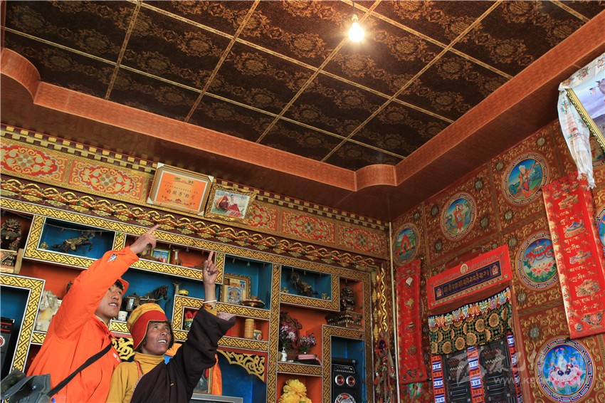 格吉大爺今年70歲了,他的孫子貢嘎是一名藏畫家,主要靠給鄉(xiāng)鄰的新房畫壁畫為生。他和哥哥兩人自學(xué)成才,鄉(xiāng)里很多人家屋內(nèi)那些精美絕倫的壁畫就出自他們兩兄弟之手。“以前電不好時(shí),天黑就無法工作,現(xiàn)在有電了,晚上都能畫,曾經(jīng)要畫1個(gè)多月的壁畫,現(xiàn)在20多天就能完成。如今電好了,電話信號(hào)也比以前強(qiáng),好多理塘縣城的朋友都打電話請(qǐng)我去給他們家里畫,這樣又能多掙些錢。”貢嘎的話語里透著對(duì)未來的幸福生活憧憬。