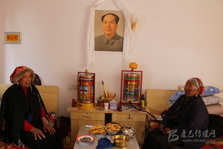 從餐廳出來(lái),記者走進(jìn)了一間15平方米左右的宿舍。兩位老人正坐在各自的木床上看電視,墻上掛著的液晶電視是連著機(jī)頂盒的。兩床之間,放著藏桌和床頭柜,藏桌上有瓜子、花生、酥油果子、牛肉等食品,亞瑪翁青老人熱情地說(shuō):“因?yàn)檎谶^(guò)藏歷新年,這些都是福利院為我們備的年貨,你也嘗嘗!”。房間里最引人注目的便是掛在床頭柜上方的系著哈達(dá)的毛主席畫(huà)像,兩位老人指著毛主席畫(huà)像動(dòng)情地說(shuō):“毛主席、共產(chǎn)黨是我們的恩人,看著他的畫(huà)像我們安心。”此外,房間里還有衣柜、配有馬桶的獨(dú)立廁所和盥洗臺(tái),毛巾、漱口盅、掃把、拖把都整齊地放在對(duì)應(yīng)位置。亞瑪翁青笑著說(shuō):“我們住的房間都趕得上縣城里的賓館了?!?/span>