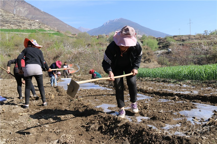 4月15日,記者從巴塘縣城出發(fā),沿國道318線走訪了該縣的5個(gè)村莊,沿途看到絕大多數(shù)耕地都鋪上了地膜,記者在該縣黨巴鄉(xiāng)玉卡通村看到正在忙碌播種玉米的村民。而這支春耕隊(duì)伍的“帶頭人”正是該村村民大尼瑪,在場的人都是其家人或鄰居。