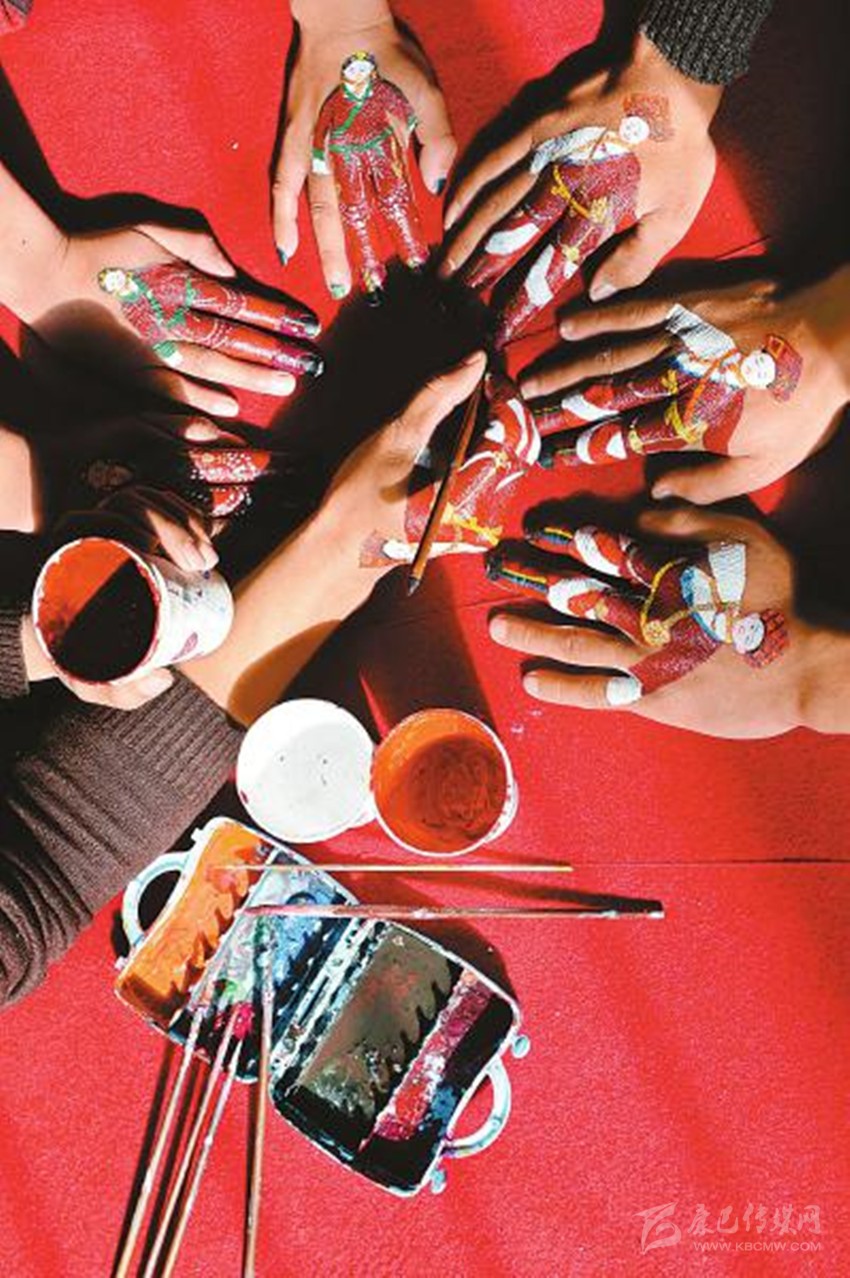 演員們互相在手指上描畫富有民族特色的人物形象。