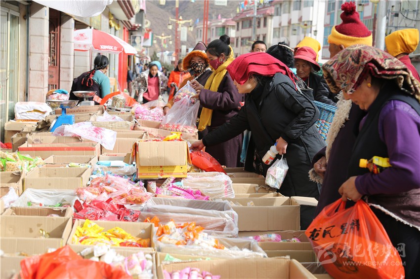新都鎮(zhèn)格色村的丹真大哥和老伴兒其吉牽著8歲的孫子正在干果店里挑選各類(lèi)干果,身后的背簍里水果、蔬菜、酥油、牛肉等農(nóng)畜產(chǎn)品以及中國(guó)結(jié)、年畫(huà)、對(duì)聯(lián)、掛圖等吉祥的節(jié)日物品應(yīng)有盡有。