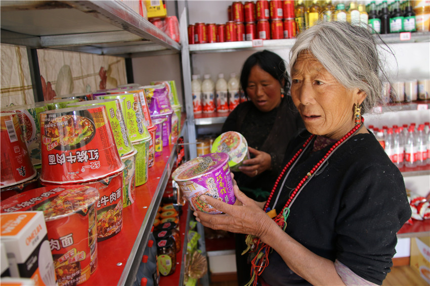 貨架上的貨物琳瑯滿目,價(jià)格與縣城大超市一分不差,還節(jié)省了路途奔波?!凹议T(mén)口就能買到東西,還又好又便宜,安逸。開(kāi)展精準(zhǔn)扶貧,硬是為大家解決了大困難?!?村民格瑪拉措道出了村民們的感激。大家共同商議決定把這超市叫做“洛蝦村感恩超市”。