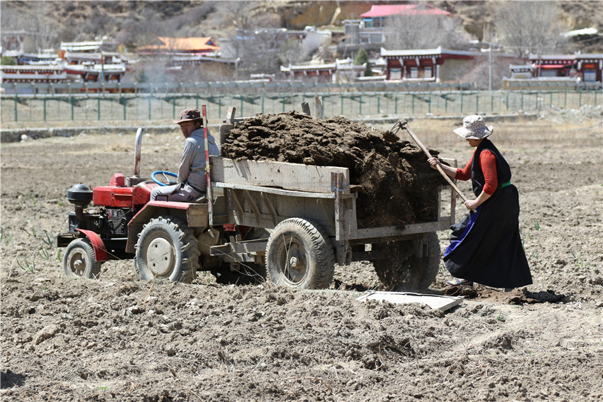 一大早,村民絨布夫婦將去年收集曬干的一袋袋牛糞裝在拖拉機(jī)上,開著拖拉機(jī)駛向自己的3畝地旁。絨布緩慢的提起液壓操作桿至45度,妻子擁青在后面用鏟子將牛糞灑在沉睡了一冬的土地上,空氣中彌漫著一股淡淡的牛糞味。
