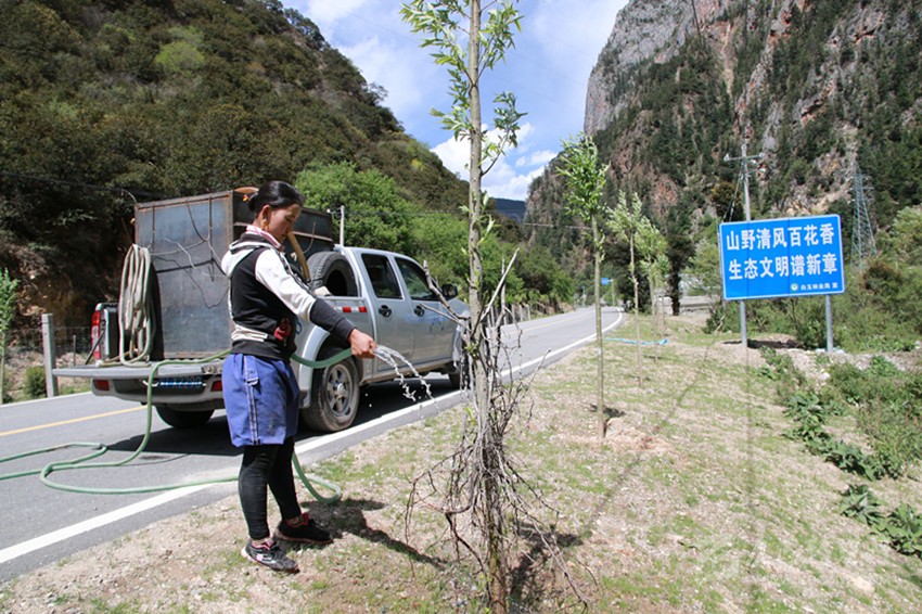 植樹容易,保持存活率很難?!爸矘渲矘?,一分栽九分管。我們植樹造林不只看數(shù)量,更注重質(zhì)量,注重栽植方法和科學(xué)的后期養(yǎng)護(hù)管理,保證樹木的成活率?!?/span>6月11日,在白玉縣絨蓋鄉(xiāng),長江造林局駐白玉管護(hù)站站長梁榮忙著進(jìn)行現(xiàn)場管護(hù)技術(shù)指導(dǎo),“把遮陽網(wǎng)裹緊點(diǎn)、把刺巴綁緊點(diǎn),以免牛和馬啃皮子;水要澆透,不然水分不夠,樹子一斷水,再想‘返陽’就難了;護(hù)欄水泥樁要栽牢,不然牛馬一撞就倒了……”。