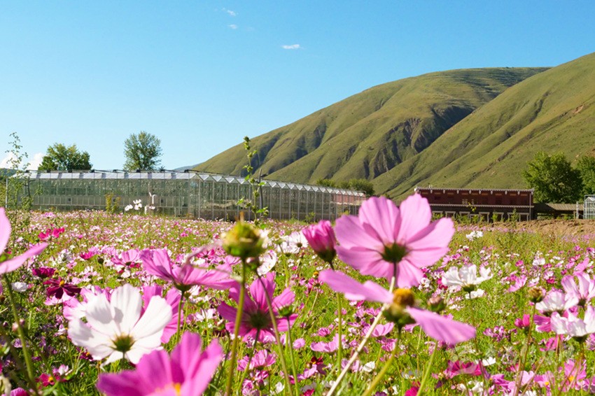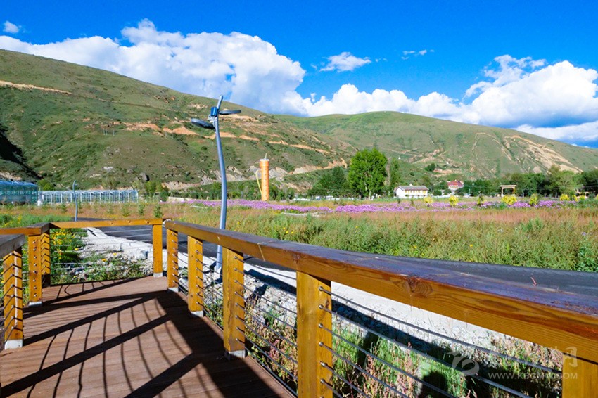 陽光下,成片開放的波斯菊搖曳生姿,成片白楊林包圍著12個16—25平方米不等的仿道孚民居外觀的樹屋,沿著鵝卵石鋪設、牡丹點綴的棧道漫步,兩側種植著落葉松、金葉垂榆、康定木蘭、五小葉槭等32種具有高原特色的植物,樹下種植以虞美人、百葉菊等17種花卉為主的草本植物;來到湖心島,不少人坐在其間休閑,有的坐在樹下乘涼,有的坐在溪邊聊天,還有不少人在伸臂橋上照相,不遠處透明的玻璃溫室展覽館已經完成建設,走過開滿桃花的拱形門,陽光灑在地面上讓人心生暖意,廢棄的水塔變成了打酥油茶用的醬桶,山、水、溪、樹、花、屋構成了不同意境的高原園林景觀。