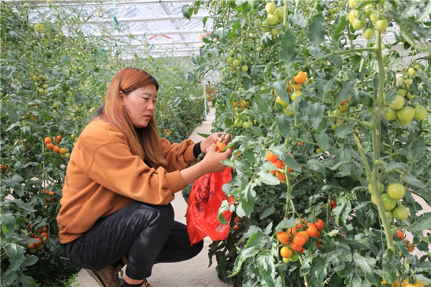 記者來到產(chǎn)業(yè)園的智能溫室大棚,只見里面各種紅的黃的綠的、大的小的番茄,掛滿藤蔓?!盎匾苑N植綠色無公害農(nóng)產(chǎn)品為主,這是我們今年開始試種的小番茄,有十來個(gè)品種,你別看它還是綠色的,其實(shí)已經(jīng)成熟了。”記者接過孟凡強(qiáng)摘下的幾個(gè)小番茄,一口咬下,香甜多汁且沁人心脾。孟凡強(qiáng)介紹,這是他們與北京神州綠鵬農(nóng)業(yè)科技有限公司合作,精選引進(jìn)中國航天工程育種的優(yōu)質(zhì)品種。除了番茄,溫室內(nèi)還種有秋葵、辣椒、小葫蘆、僧帽瓜等蔬菜,處處綠意盎然。