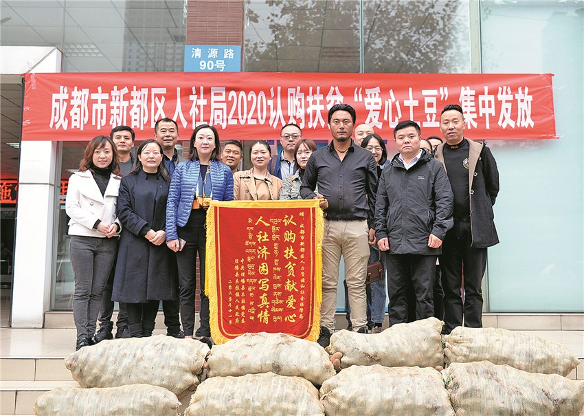 “感謝你們幫助認(rèn)購(gòu)3萬(wàn)余斤土豆……扎西德勒!”11月6日上午8點(diǎn)36分,“愛(ài)心土豆”車隊(duì)剛在新都區(qū)人社局停車場(chǎng)停穩(wěn),降央吉村一個(gè)躍步下車,為等候多時(shí)的人社局送上“認(rèn)購(gòu)扶貧獻(xiàn)愛(ài)心、人社濟(jì)困寫(xiě)真情”的錦旗。