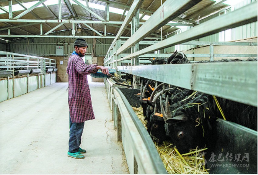 1月28日,白玉黑山羊燈龍保種繁育基地,村民向巴志瑪正在飼養(yǎng)黑山羊。養(yǎng)羊有工資、種草有收入,向巴志瑪說自己是發(fā)了“羊財(cái)”。