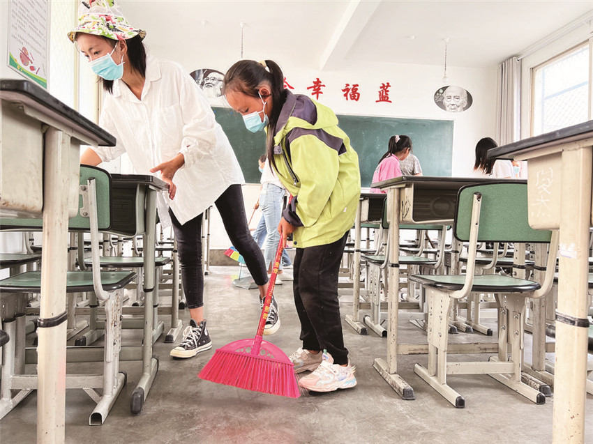 在學(xué)校一樓走廊,記者看到墻壁上貼滿了孩子們自制的民族團(tuán)結(jié)手抄報(bào)和五十六個民族一家親的畫作。瀘定橋小學(xué)副校長杜德琴告訴記者,這是學(xué)校開展鑄牢中華民族共同體意識主題教育實(shí)踐活動的內(nèi)容之一?!斑@些都是老師、家長和學(xué)生一起完成的,‘團(tuán)結(jié)’與‘奮進(jìn)’已深深印刻在瀘定橋小學(xué)每一個人的言行中,我們是愛的傳遞者,我們是在以實(shí)際行動踐行校訓(xùn)。我希望災(zāi)區(qū)的孩子們能盡快走進(jìn)學(xué)校,繼續(xù)學(xué)業(yè)?!?/p>
