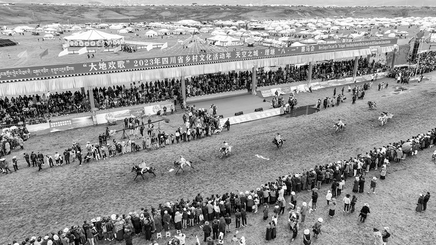 “中國藏族賽馬文化之鄉(xiāng)”“理塘八一傳統(tǒng)賽馬會”是四川涉藏州縣規(guī)模最大的賽馬會,賽馬傳統(tǒng)延續(xù)長達(dá)400余年?!霸缇吐犝f過馬背上的理塘,今天終于親眼所見,實在不虛此行。草原追風(fēng),策馬飛奔,蹄聲如雷,震徹山野,這是多么壯美的理塘萬馬奔騰圖?。《嘞脒h(yuǎn)離城市的喧囂,策馬揚鞭,馳騁草原,豪邁瀟灑,勇往直前。以后每一年的理塘賽馬活動,我一定會帶上家人再來這里,因為理塘,可謂是心靈棲息的地方?!痹凇按蟮貧g歌”2023年四川省鄉(xiāng)村文化活動年——天空之城·理塘“八·一”賽馬會上,來自北京的游客石磊被當(dāng)?shù)刭愸R文化吸引,和朋友玩得不亦樂乎。