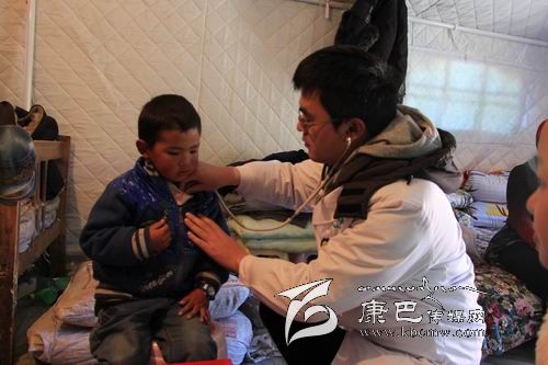 在新都橋鎮(zhèn)東俄洛三村的一頂救災(zāi)帳篷里,來(lái)自“雅安市抗震救災(zāi)醫(yī)療救援小組石棉分隊(duì)”的石棉縣人民醫(yī)院內(nèi)科醫(yī)生李登豐正在給當(dāng)?shù)貎和恋嵌嗉獧z查身體。土登多吉的母親說(shuō)孩子這兩天感冒了,經(jīng)過(guò)檢查,李登豐發(fā)現(xiàn)土登多吉并未發(fā)燒,只是扁桃體有點(diǎn)發(fā)炎,于是趕緊讓同行的護(hù)理人員拿來(lái)了治療感冒和消炎的藥物。