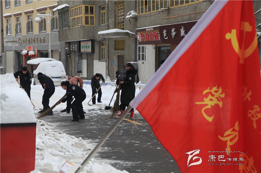 一陣鐵鏟的撞擊聲把記者吸引到了州公安局辦公大樓附近,大雪中,一面寫有黨員突擊隊字樣的紅旗格外引人注目。經(jīng)過訊問記者得知,這支鏟雪隊是由州公安局的黨員和民警組成的,因為停電,再加之發(fā)現(xiàn)辦公樓外的街道上積雪太厚,給行車、行人造成了不少麻煩,所以州公安局的黨員、民警組成了這支臨時突擊隊,分成兩個小組分頭突擊。在他們身后,已經(jīng)有數(shù)百米街道上的積雪被清除。此外,在將軍橋附近,武警官兵也加入到清理積雪的行列,那道橄欖綠在雪中顯得格外美麗。