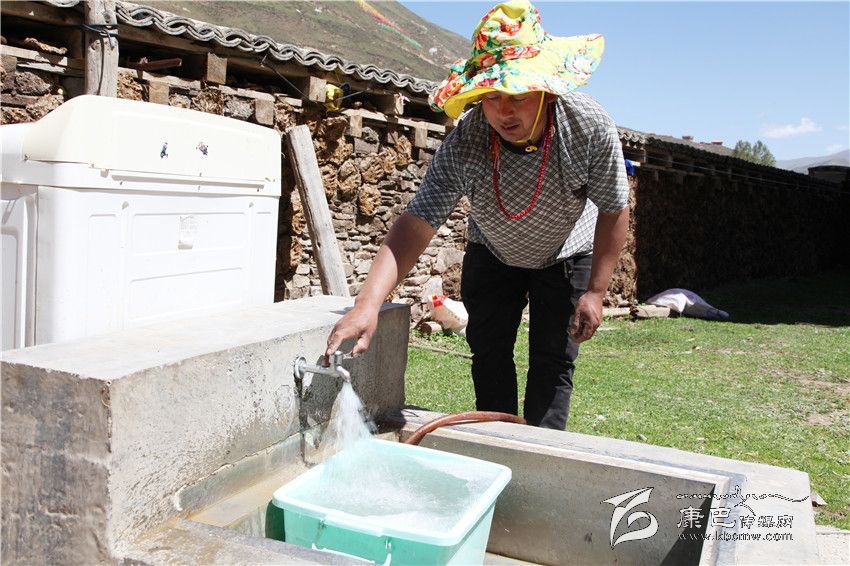 這是一幢位于半山坡上的漂亮藏房,這是一座寬敞干凈的農(nóng)家院落。正在院子里的水龍頭前洗衣服的布窮拉,一面羞紅著臉招呼著我們,一面將洗衣粉撒進(jìn)洗衣機(jī)里,高速運(yùn)轉(zhuǎn)的洗衣機(jī)不時(shí)拋出幾朵洗衣粉泡沫。說(shuō)起自來(lái)水,不善言辭的布窮拉確實(shí)感觸尤深:“我家附近只住了4戶人家,根本就沒(méi)想過(guò)這輩子還能用上自來(lái)水。去年鄉(xiāng)上在實(shí)施第二批人口安全飲水工程項(xiàng)目時(shí),居然也把我們幾家規(guī)劃進(jìn)去了。當(dāng)時(shí),我以為只是說(shuō)說(shuō)而已,沒(méi)想到20來(lái)天后施工隊(duì)果真就把水管鋪設(shè)到了我家。通水那天,我們幾家人還特意慶祝了一盤(pán)。如今,我再也不用每天往返到色曲河背水了,我家的背水塑料桶隨之也就‘下崗’了。”