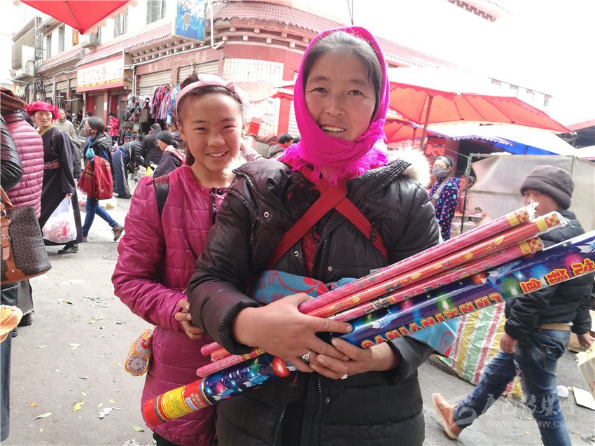 在農貿市場,小達措因為媽媽給自己買了煙花,顯得很開心。來自達通瑪?shù)哪撩裨髡谕侠瓩C上搬運大包小包的年貨。扎西說:“因為有些親戚忙著在家打掃房屋、炸麻花,加上我有車,比較方便,所以就幫他們帶些年貨回去?!?/span>