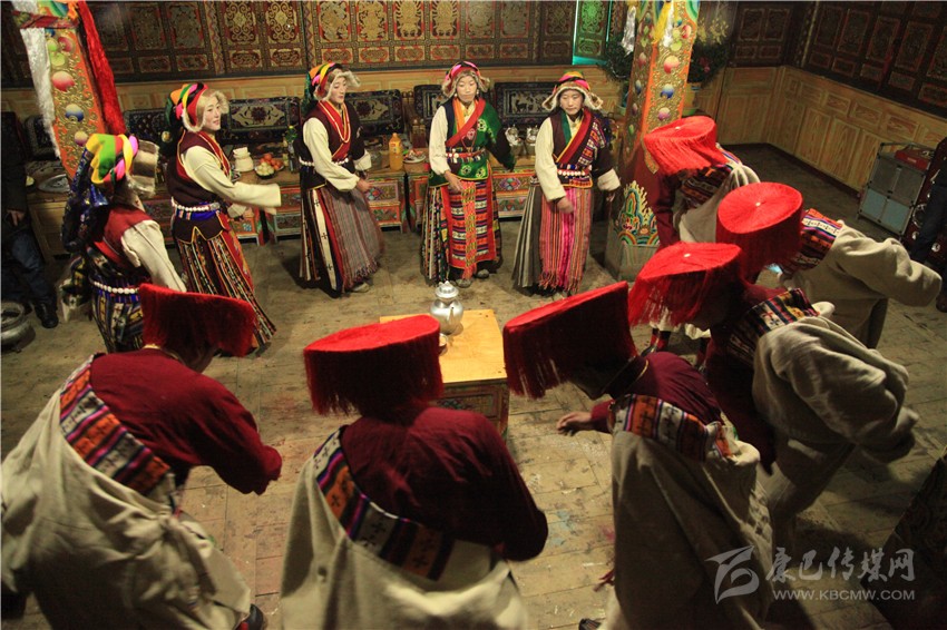 一家人穿上節(jié)日盛裝,按輩序就座。主婦手捧吉祥斗恭恭敬敬地走到長(zhǎng)輩跟前說(shuō)“扎西德勒”,對(duì)方抓幾粒麥子邊向上撒邊祝福說(shuō):“扎西德勒!美滿幸福,祝主婦身體健康,預(yù)祝明年大家仍如此團(tuán)聚歡慶?!痹僮ヒ稽c(diǎn)切瑪送進(jìn)嘴里。家庭儀式后,家中兩人一個(gè)拿青稞酒、銀酒碗,一個(gè)手捧切瑪,到左鄰右舍、親朋好友家拜年,敬獻(xiàn)切瑪、青稞酒,互相祝福。
