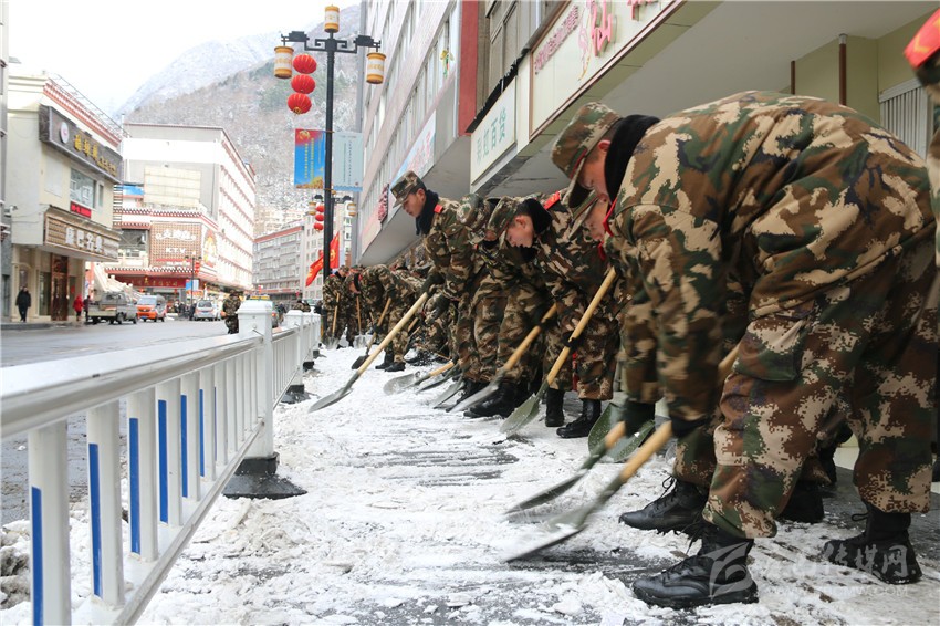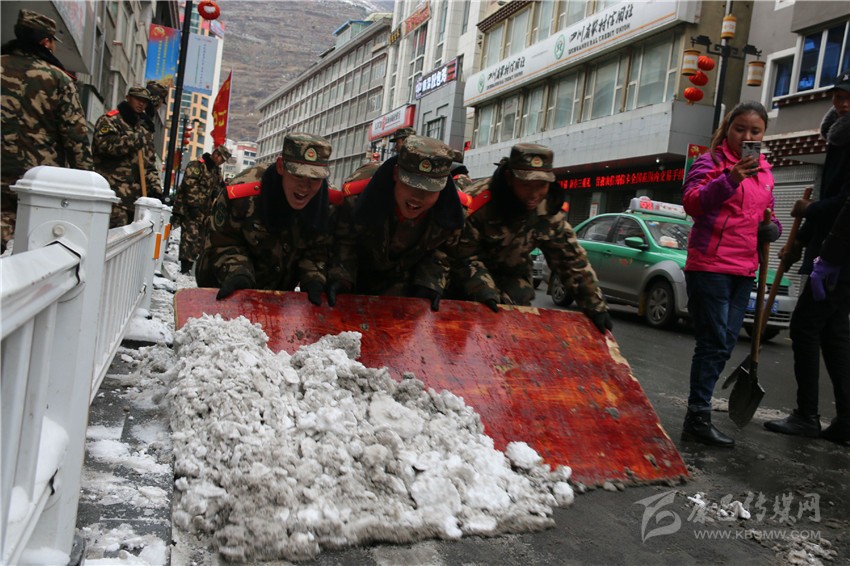 經(jīng)過奮戰(zhàn),僅半天時間,康定市城區(qū)主要路段大面積積雪被清除一空,全體官兵又一次用實際行動踐行了“把駐地當(dāng)故鄉(xiāng)、視人民為父母”的光榮傳統(tǒng)。圖為官兵正在清理路面積雪。