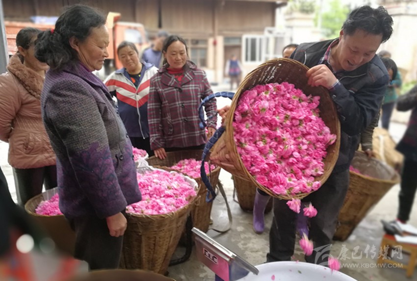16日上午,小雨停了下來,趕在太陽出來之前采摘的玫瑰花出油率好,是采摘的黃金時(shí)間。在燕子溝鎮(zhèn)新龍門子村生產(chǎn)加工點(diǎn),周邊農(nóng)戶將采摘的粉色玫瑰花瓣過秤,逐筐倒進(jìn)特定的堆放地點(diǎn),農(nóng)戶們也收到了應(yīng)得的勞務(wù)收入,空氣中彌漫著一股玫瑰花特有的芳香和浪漫,也充滿了當(dāng)?shù)匕傩招腋:吞鹈鄣奈兜馈?/span>