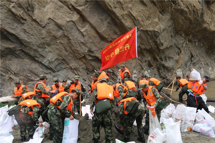 滾滾洪水無情地沖擊著路基和河堤,水位在不斷抬高,官兵迅速填裝沙袋,踩著漫過膝蓋的洪水運往最危險的地段,手抬肩抗筑起一段段鋼鐵堤壩。官兵們奮戰(zhàn)了7個多小時,由于被淹沒的路基和河堤較長,高原的氣候寒冷,加之在水中浸泡時間過長,一些戰(zhàn)士腳被凍得發(fā)紫,也渾然不覺,顧不上寒冷和長時間裝填搬運沙袋所帶來的疲憊。