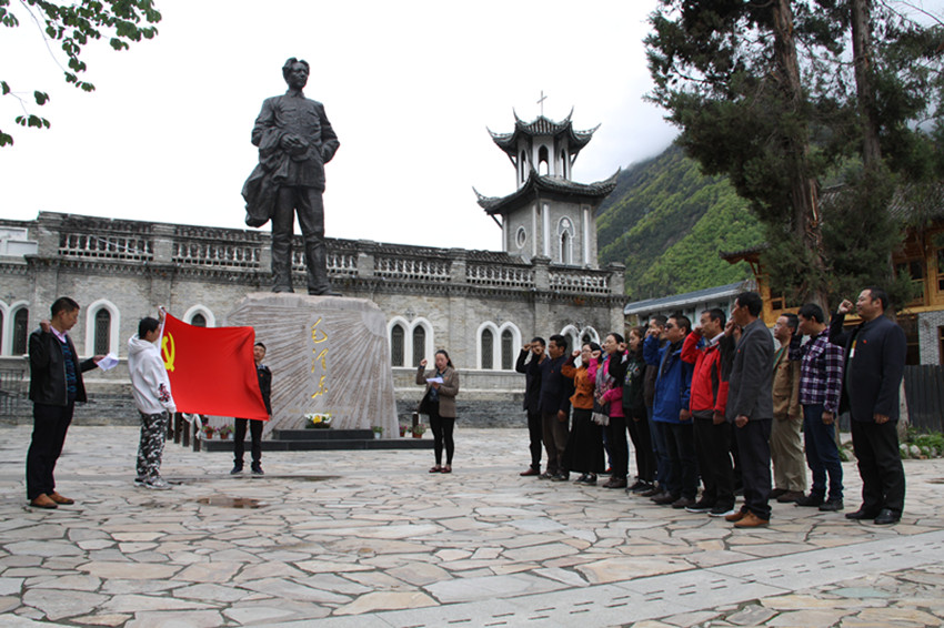 本網(wǎng)訊 (本網(wǎng)記者 秦松 攝影報(bào)道)日前,甘孜日報(bào)社全體黨員與群眾工作全覆蓋結(jié)對共建共創(chuàng)的海螺溝燕子溝鎮(zhèn)的躍進(jìn)坪村支部、南門關(guān)村支部、麻柳林村支部、喇嘛溝村支部的黨員,懷著崇敬的心情來到磨西長征紀(jì)念館毛主席塑像前,舉行緬懷革命先烈、重溫入黨誓詞活動?;顒又?,黨員們還與共建共創(chuàng)支部黨員進(jìn)行了座談。圖為宣誓活動現(xiàn)場。