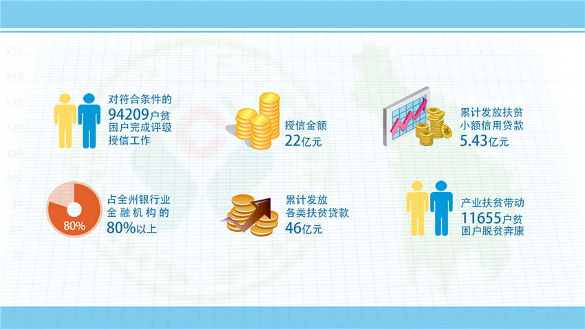 ——強化信貸扶持。緊緊圍繞全州脫貧退出總體目標,打破各縣劃分片區(qū)、劃分任務的局面,使脫貧攻堅工作從行政手段調整到市場競爭和民生工程兼顧,堅持“三個一百”——即百分百對符合條件的建檔立卡貧困戶進行評級授信,授信面達到100%;百分百滿足貧困戶有效信貸需求;百分百滿足產業(yè)帶動扶貧項目有效信貸需求,加強與18個縣黨委政府的溝通對接,瞄準每個縣的地方特產產業(yè),因地制宜,為每個縣量身打造“一縣一策”的金融服務方案,累計發(fā)放各類產業(yè)、項目帶動扶貧貸款20.69億元。