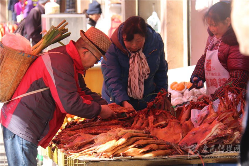 在離張大哥的鋪面十幾米的地方,豬肉商販李大姐正忙著幫人制作香腸,她的客人何康德是“老康定”,今天專程來購買臘肉、香腸等年貨。交談中,何康德說:“以前過年,都是自己在家炒花生、炸果子,現(xiàn)在市場上啥子都有,方便多了;到市場上和大家一起購年貨,熱鬧、喜慶,有年味兒?!?/span>