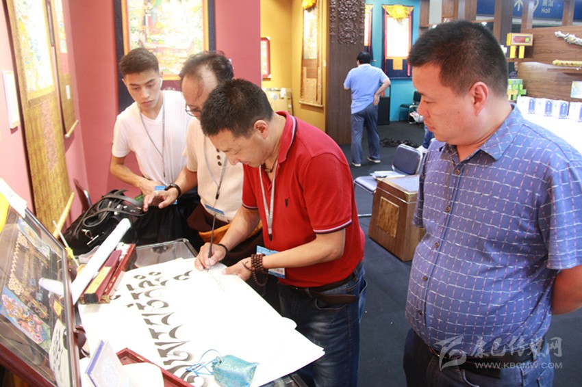 在甘孜展館“遺·甘孜”展區(qū),人們把藏文書法展臺(tái)圍了個(gè)水泄不通,我州甘孜縣民族中學(xué)高級(jí)教師、省級(jí)藏文書法傳承人巴松鄧珠站在展臺(tái)前用竹筆蘸著墨汁,在一張張不大的紙片上寫下祝福的藏文,贈(zèng)與參觀者。
