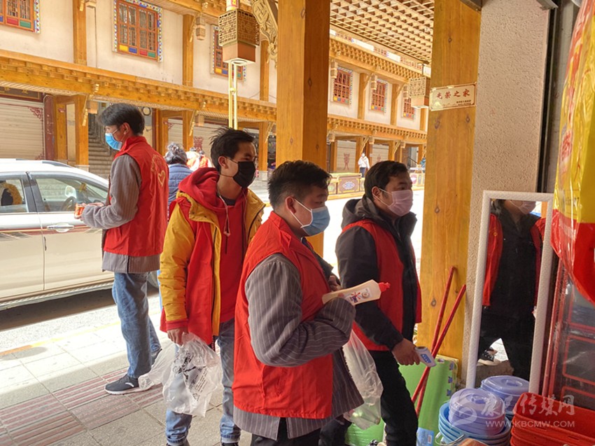 德格縣志愿者為商戶(hù)發(fā)放消毒用品。