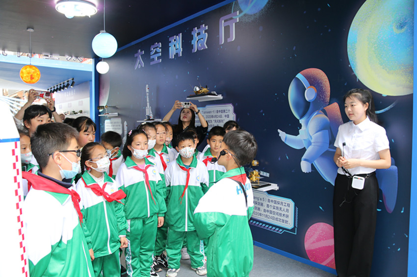 “航天夢(mèng)是中國(guó)夢(mèng)、華夏夢(mèng),神舟十六號(hào)載人飛船發(fā)射成功并進(jìn)入預(yù)定軌道。古人仰望星空,幻想上天攬?jiān)碌膲?mèng)想,在一代代中國(guó)航天人的努力下逐漸變?yōu)榱爽F(xiàn)實(shí)?!薄凹t領(lǐng)巾”講解員劉嘉沐在解說(shuō)他負(fù)責(zé)的天空科技廳時(shí),將這一喜訊分享給了在場(chǎng)的同學(xué)們。“希望能借神舟十六號(hào)載人飛船發(fā)射成功的機(jī)會(huì),在科普周活動(dòng)中普及航天知識(shí),讓更多的學(xué)生深入了解航天文化,引導(dǎo)青少年傳承航天精神、點(diǎn)燃航天夢(mèng)想?!敝菘茀f(xié)負(fù)責(zé)人告訴記者。