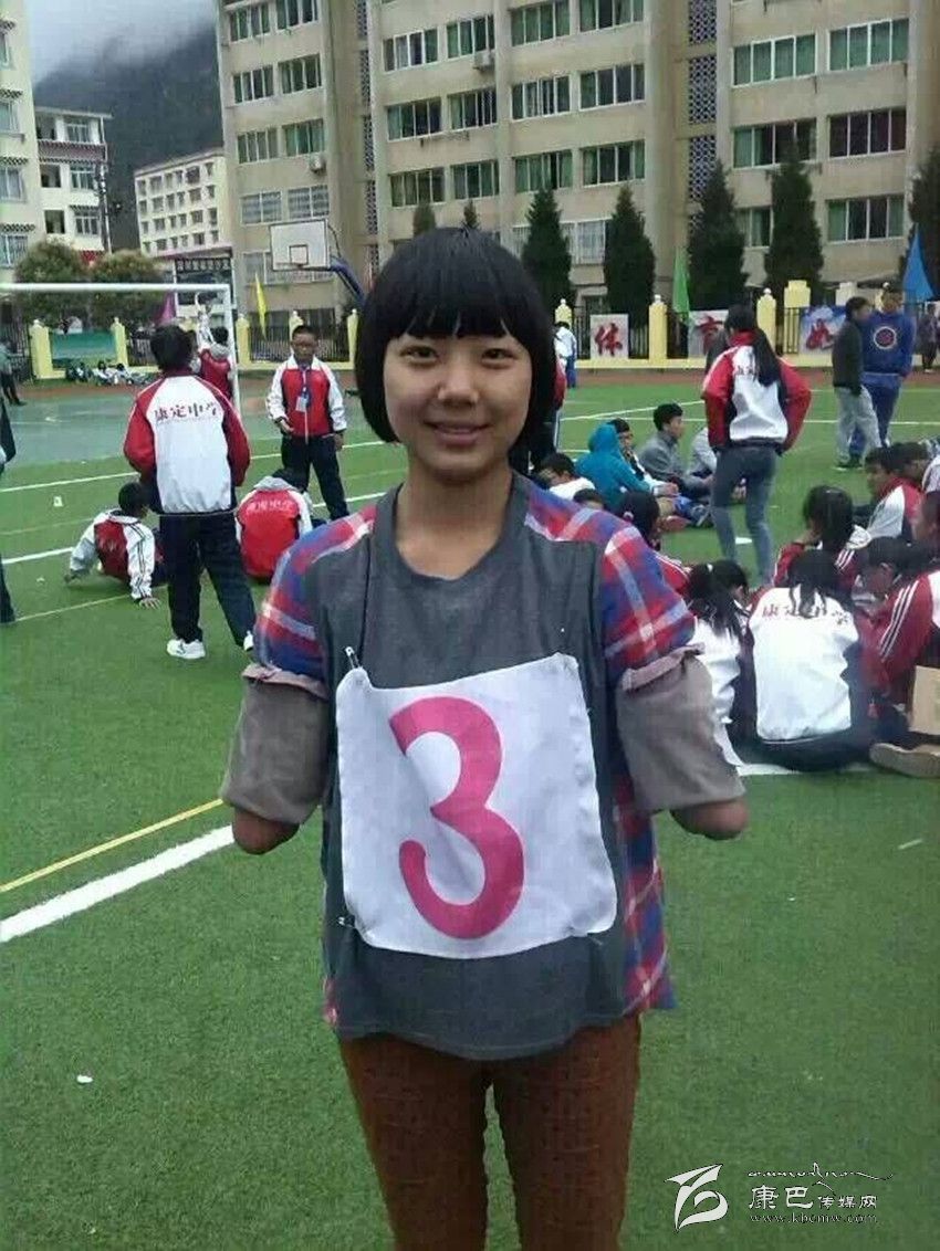 在康定中學校園里,你會邂逅這樣一位女孩:臉上永遠燦爛著陽光般的微笑,雙眼永遠閃爍著自信樂觀的光芒。教室里,她聚精會神地聽課;圖書館里,她專心致志地讀書;操場上,她身輕如燕地奔跑;寢室里,她開心爽朗地和同學交流??赡阕屑氁豢矗谷粵]有雙臂,就像折翼的天使。她就是該校高2016屆8班學生,羌族女孩許方燕。行走在高原的風中,她是一幀讓每一個人內心泛起感動漣漪的美麗風景……