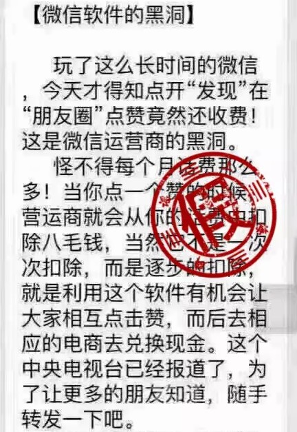 近日,微信群中流傳一條消息稱(chēng):“玩了這么長(zhǎng)時(shí)間的微信,今天才得知點(diǎn)贊竟然還收費(fèi)。當(dāng)你點(diǎn)一個(gè)贊的時(shí)候,運(yùn)營(yíng)商就會(huì)從你的話(huà)費(fèi)中扣除八毛錢(qián)……中央電視臺(tái)已經(jīng)報(bào)道了。”