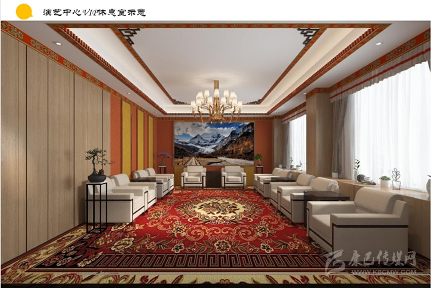 藏式繪畫、門板藏式浮雕造型、藏式鼓架、展示康定城的浮雕........記者看到,效果圖中農(nóng)牧民演藝中心的設(shè)計(jì)充滿了“傳統(tǒng)文化”的味道。頂部設(shè)計(jì)利用了線條的柔韌性和律動性,使空間更有線條感,看起來像康定的潺潺河流,墻面分別使用樂器、山巒疊成的變化形式,營造出獨(dú)特的民族風(fēng)情。通過自熱和人文的結(jié)合展示出康定人民樂觀向上、民族團(tuán)結(jié)的和樂畫面。地面設(shè)計(jì)采用了暖(冷)色座椅與富有民族特色的色彩搭配,營造出一種身處藏家,暢游藏文化海洋的意境。