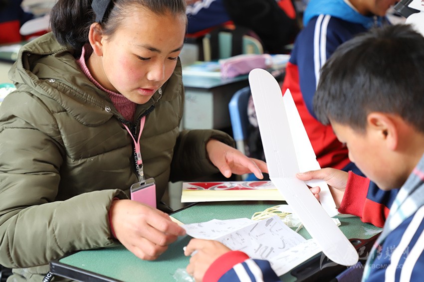 專家團隊的老師們給師生們帶來了各種型號的無人機,為大家演示了通過手機掃碼就能識別風景、動物及模擬聲音的3D互動科普動畫,讓師生們聆聽了來自外太空的神秘之聲……學生們參與積極、討論熱烈,能在老師的幫助下自己動手制作橡皮筋航模飛機。