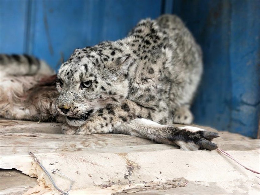 不放心受傷雪豹的隊員們隨即將發(fā)現(xiàn)的情況按屬地管理原則上報了該鄉(xiāng)黨委政府,聯(lián)系了行業(yè)主管部門林草局,并上報縣委縣政府,縣委政府主要領(lǐng)導(dǎo)高度重視要求鄉(xiāng)黨委政府和林草局賡即組織人員再到現(xiàn)場附近搜尋受傷雪豹看是否需要救治。當(dāng)一行人再次來到現(xiàn)場,發(fā)現(xiàn)受傷的雪豹可能由于舍不得“獵物”去而復(fù)返正趴在巖羊旁,也可能由于傷情見人前來并未離去。大家在簡單商議后,決定先由獸醫(yī)為雪豹現(xiàn)場查驗傷勢。為防止雪豹傷人,在大家的配合下做出必要的防護(hù)措施后,開始為雪豹查驗傷勢,經(jīng)查驗發(fā)現(xiàn)該雪豹左前肢和左后肢均被咬傷,其中左前肢受貫穿性咬傷,傷勢較重,造成其無法行走,隨即大家決定將雪豹帶回救治。