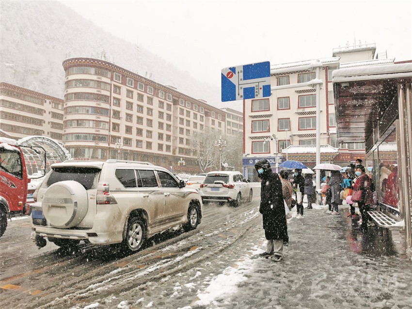 圖為在公交站臺(tái)前冒雪等待公交車的康定市民。