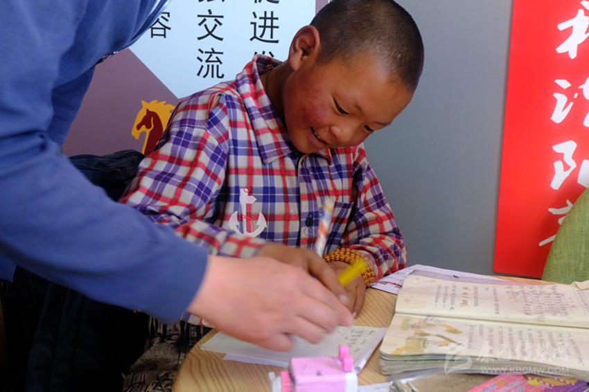 一筆一劃,小波認真地練習著課文里的漢字,志愿者程勇則在一旁細心地輔導(dǎo)。從漢字拼讀到聲調(diào)發(fā)音,從筆順筆畫到組詞造句,小波聽得神情專注。另一邊,達熱、俄覺、洛洛、友珍四名小學五年級的女生也抓緊時間,向志愿者老師請教分數(shù)的加減法運算,老師在草稿本上通過畫圖的方式讓孩子更直觀地了解數(shù)學運算邏輯。如今,色達新時代文明實踐中心志愿者在安康社區(qū)的“周末班”義務(wù)教育輔導(dǎo)活動已成為社區(qū)的名片之一。