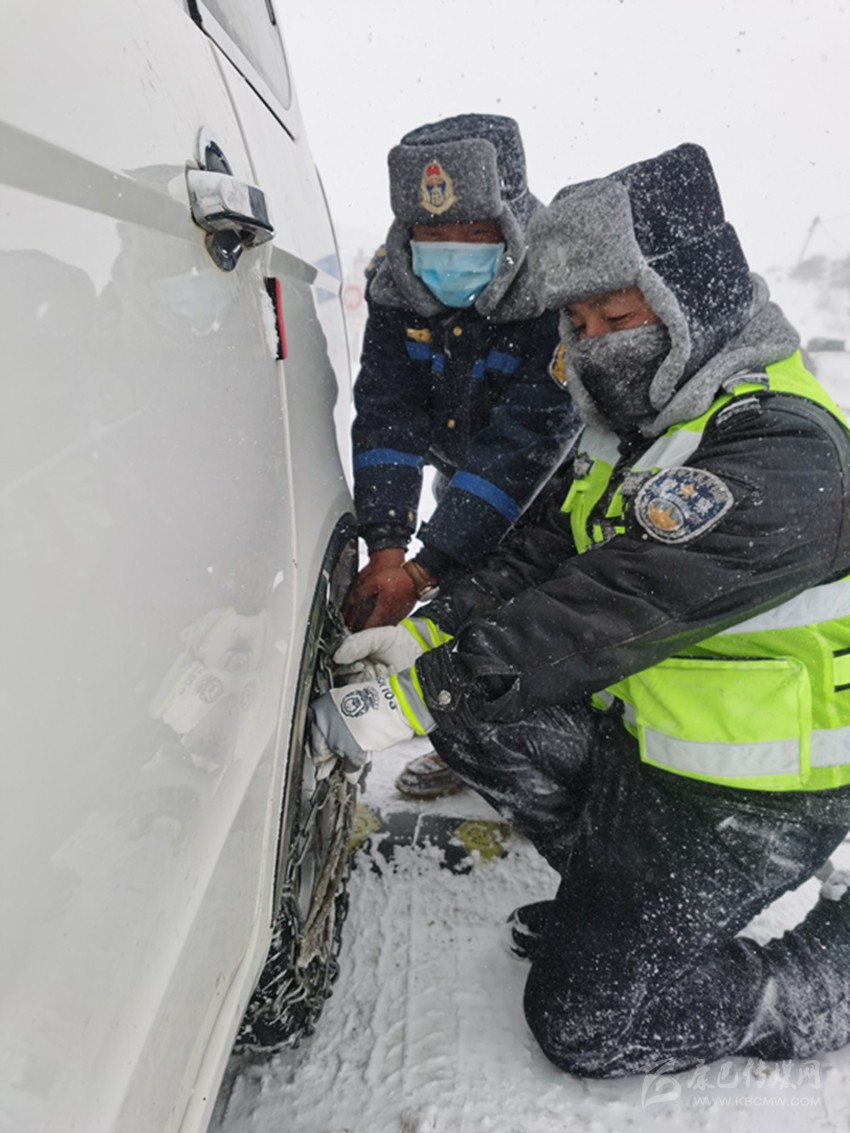 圖為錯(cuò)阿卡點(diǎn)民警幫助過(guò)往車(chē)輛安裝防滑鏈。