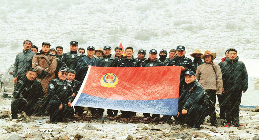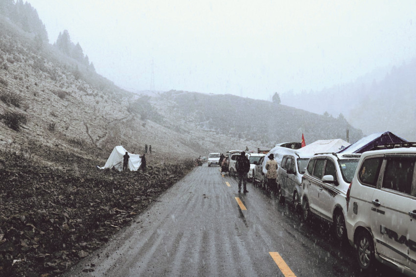然而,高原的天、娃娃的臉,說變就變。剛剛還艷陽高照的晴好天氣,瞬間寒風(fēng)四起,鵝毛大雪不一會便覆蓋了整個山野。由于到達(dá)蟲草采集點還需4、50分鐘人力轉(zhuǎn)運(yùn)物資,受天氣影響,前行受阻,擔(dān)任護(hù)送任務(wù)的民輔警當(dāng)即幫助群眾搭建臨時安置點,風(fēng)雪中警民互助的身影像極了一家人。一切收拾停當(dāng),盡管風(fēng)寒雪大,條件艱辛,樂觀的群眾和伴隨服務(wù)的民輔警還不忘在風(fēng)雪中來一張合照,他們說,這是歷年來的慣例,每次上山采集蟲草和下山返程,他們都會一個不少地拍張“全家?!?,以此留念蟲草季警民相依的美好記憶。