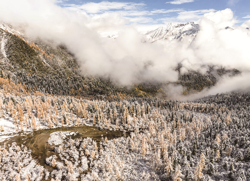 雪山、藍天白云和黨嶺村的彩林構(gòu)成一幅優(yōu)美的畫卷。新華社 發(fā)