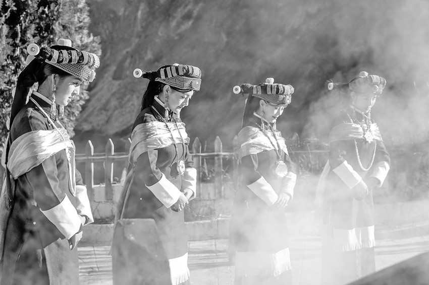 嘉賓體驗團(tuán)首先來到位于甲居藏寨景區(qū)里的“點石·寶生居”特色民宿,只見一位年邁的嘉絨長者正主持“成人禮”儀式,桑煙裊裊,為即將成年的少女送去了誠摯祝福。完成儀式的嘉絨姑娘們隨長者一同跳起了非遺傳統(tǒng)舞蹈孔雀鍋莊,千年前東女古國的風(fēng)采得以重現(xiàn)。